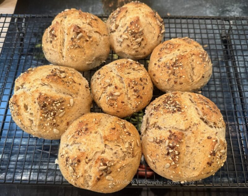 Seit einiger Zeit gibt es bei uns morgens immer frisch gebackene Brötchen zum Frühstück. Es macht mir wieder richtig Spaß, Brot und Brötchen zu backen und wir genießen das sehr. Heute habe ich etwas experimentiert. Bewährt haben sich bei uns „Einfache Sauerteigbrötchen“ nach einem Rezept, was ich bei Instagram entdeckt habe (Werbung ohne Auftrag). Heute dachte ich, so ein paar Körner wären da auch nicht schlecht, also zauberte ich so eine Art Weltmeister-Brötchen. Ich werde sie auf jeden Fall wieder backen – sooooo lecker!